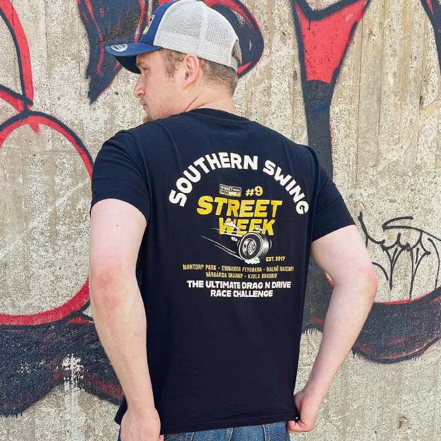 I år kör Street Week söderut, vi kallar den för Southern Swing. Klassisk svart t-shirt i skön bomull med tryck på vänster bröst och stort på ryggen. RACING HISTORY IN THE MAKING!