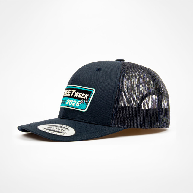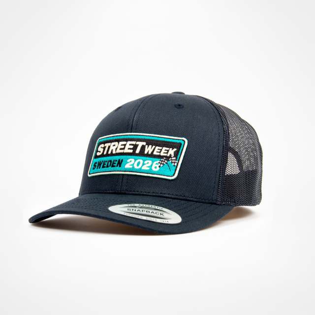 Klassisk retro trucker-keps i mörkblått med nätpaneler för bra ventilation. Kepsen har en böjd skärm och justerbar storlek för en perfekt och bekväm passform. Den broderade Street Week Sweden 2026-loggan på framsidan ger en snygg, tidlös look som passar både på tävling och i vardagen. En självklar accessoar för alla motorsportfans som vill visa sin passion med stil.