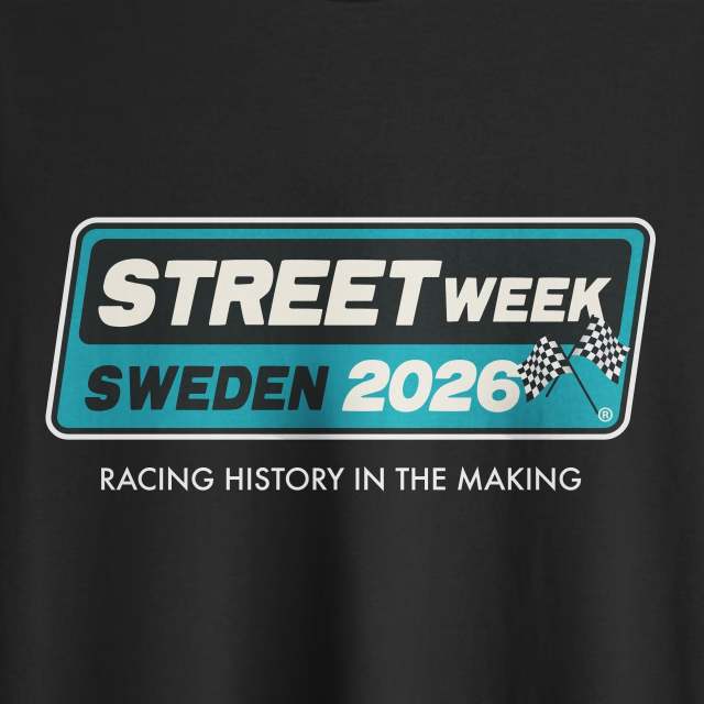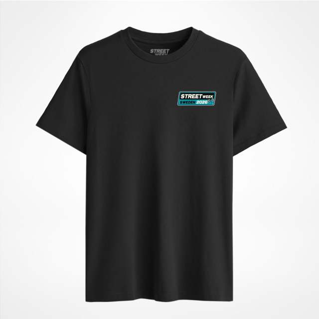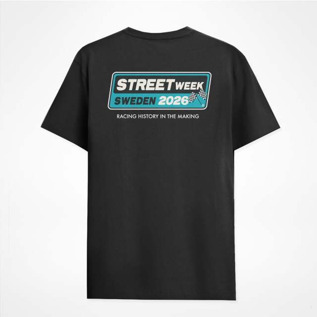 Klassisk svart t-shirt i skön bomull för Street Week 2026 med liten logo på bröstet och Street Week 2026 logo stort på ryggen. RACING HISTORY IN THE MAKING!